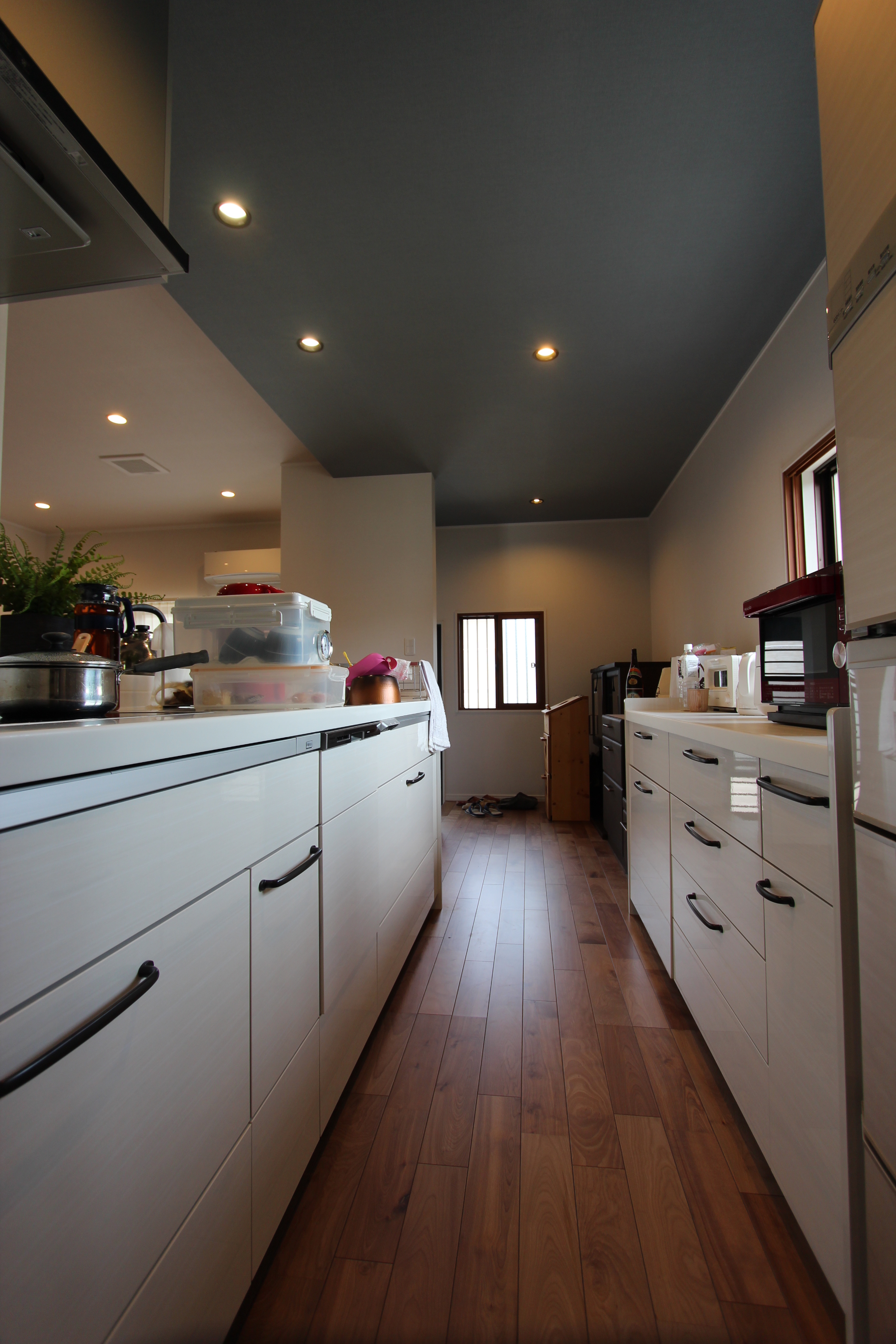 【天井の間接照明&ダウンライト】キッチンはこだわりのブルーの天井で、ライン照明を入れ間接的な光に。