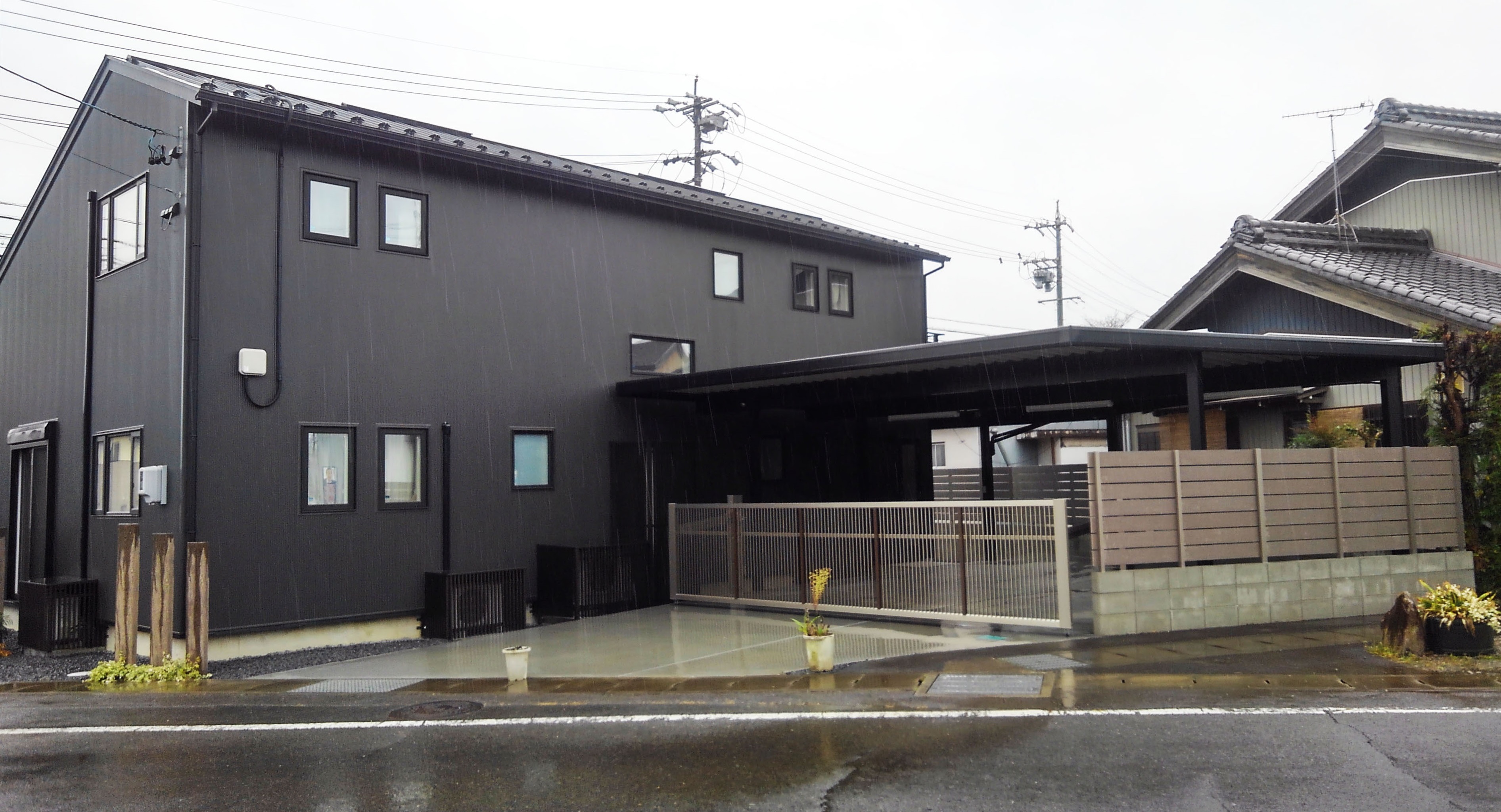 駐車スペースは土地が斜めになっている部分があった為、土地に合わせて作ることができる「オーダーメイド折板カーポート」と、外観格子に合わせたスタイリッシュなオーバーゲートを提案しました。