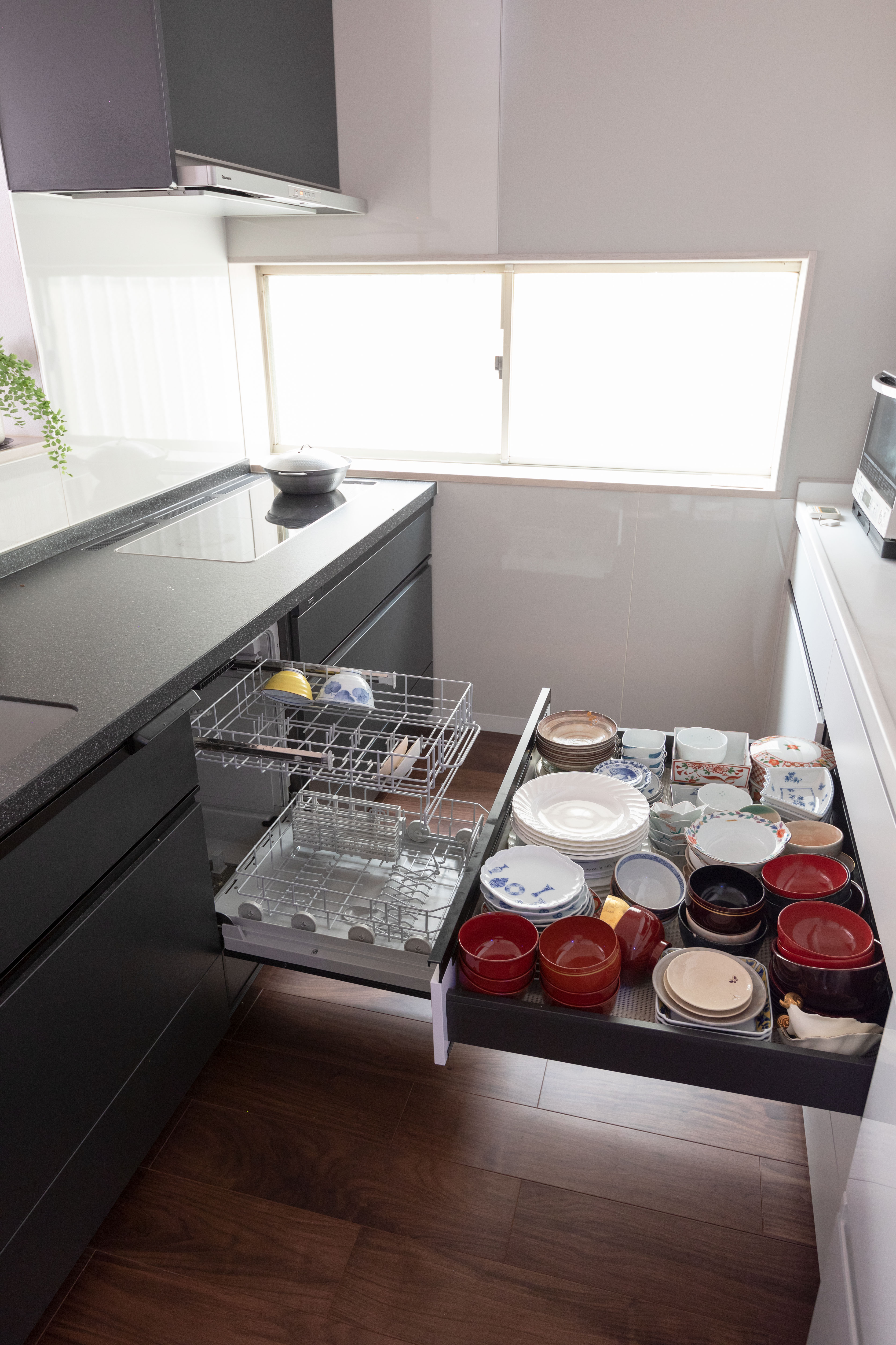 食器棚も奥行きが深く引き出しがフルに引き出せるので、これまで食器棚の奥で眠っていた大量の食器も、上からパッと見てどの食器がどこにあるのかすぐに分かり取り出しやすくなりました。