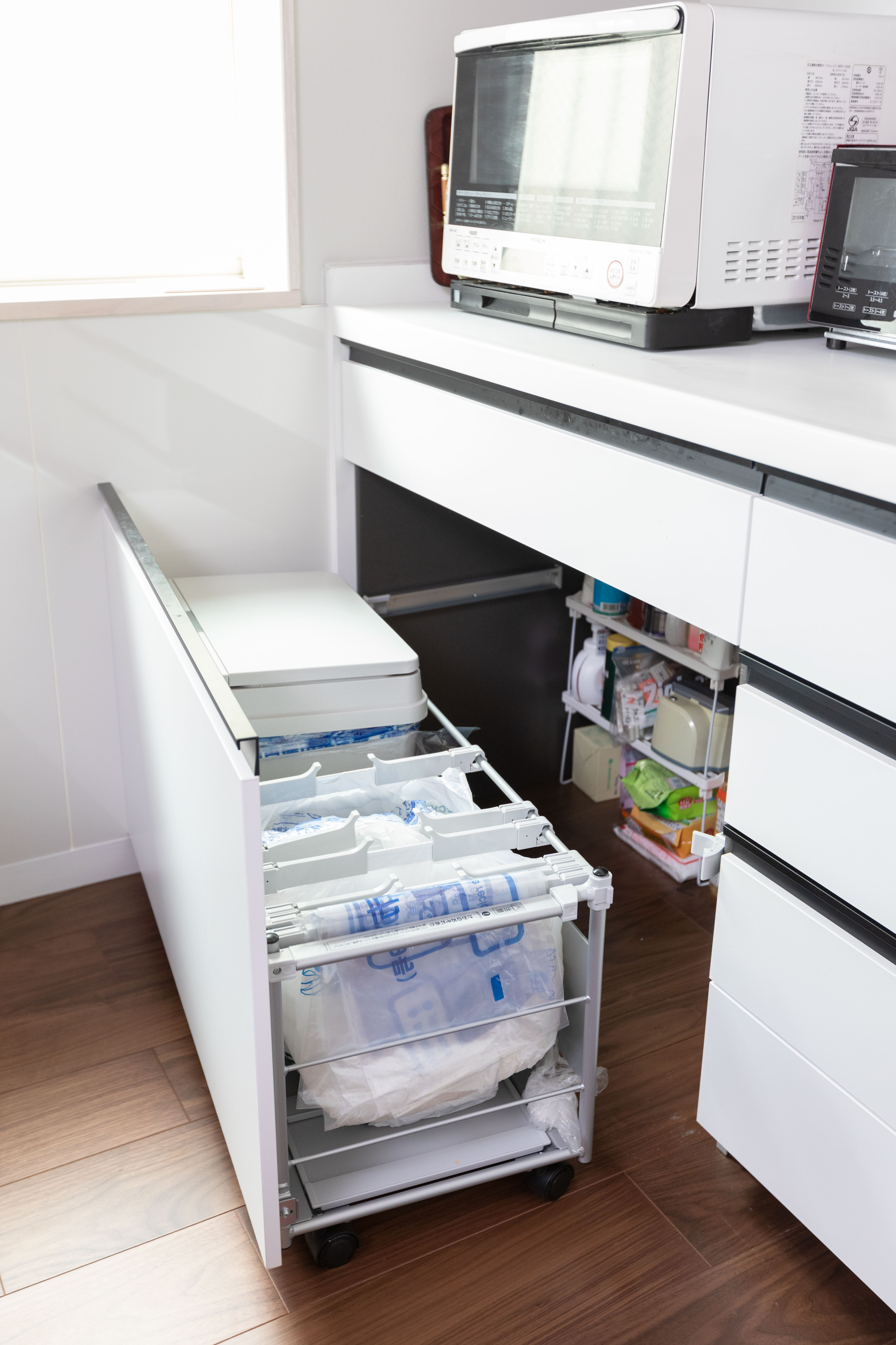 ・カップボード内にダストボックスを収納してスッキリと。奥はストック置き場として有効活用できます。