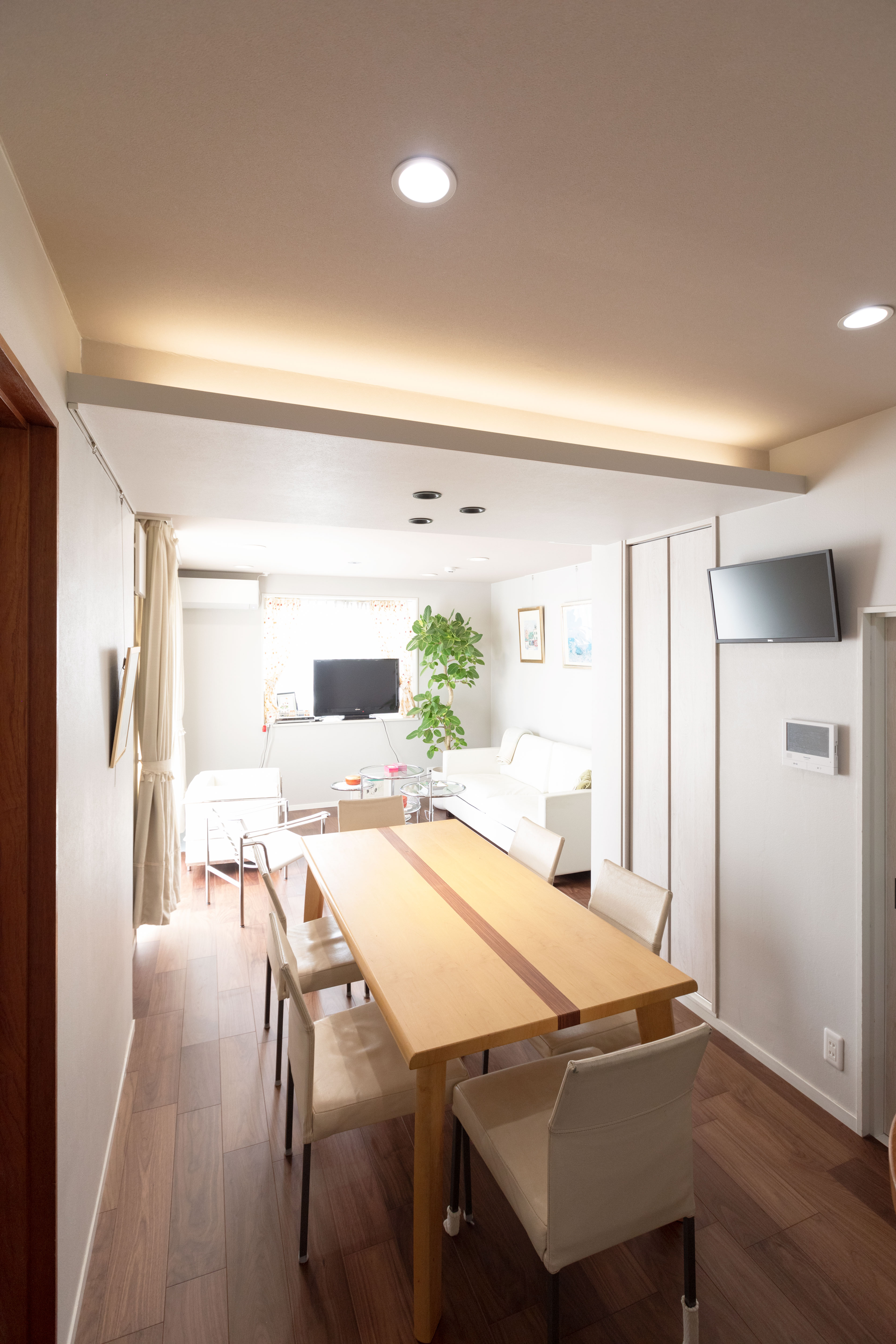リビング・ダイニングは、天井にあった梁の凸部分を活かして折り下げ天井に変更し、間接照明を埋め込みました。
