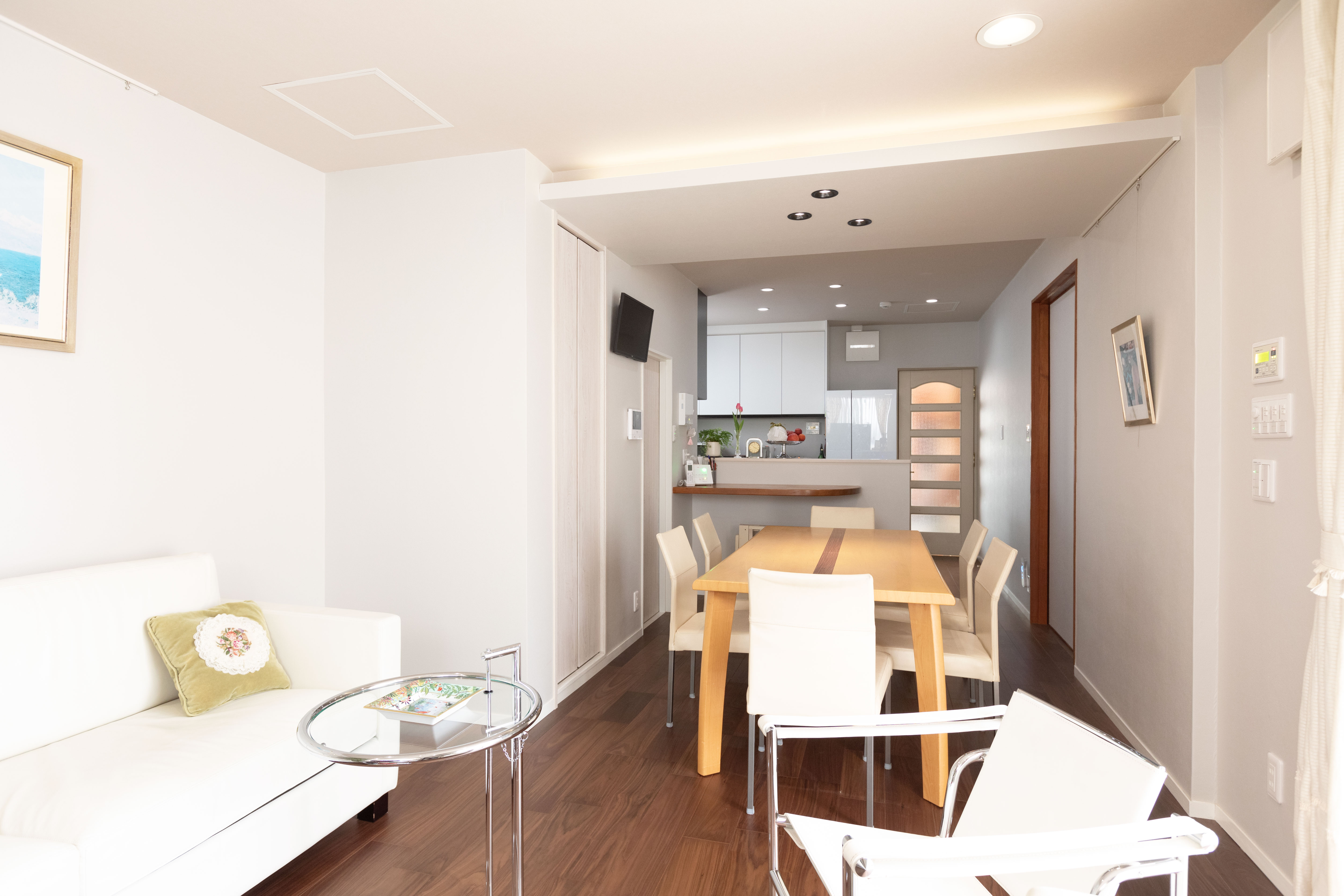 ・リビングとダイニングの間にあった引き戸を撤去し壁紙や床材を一新、LDKをひとつながりの空間にしました。