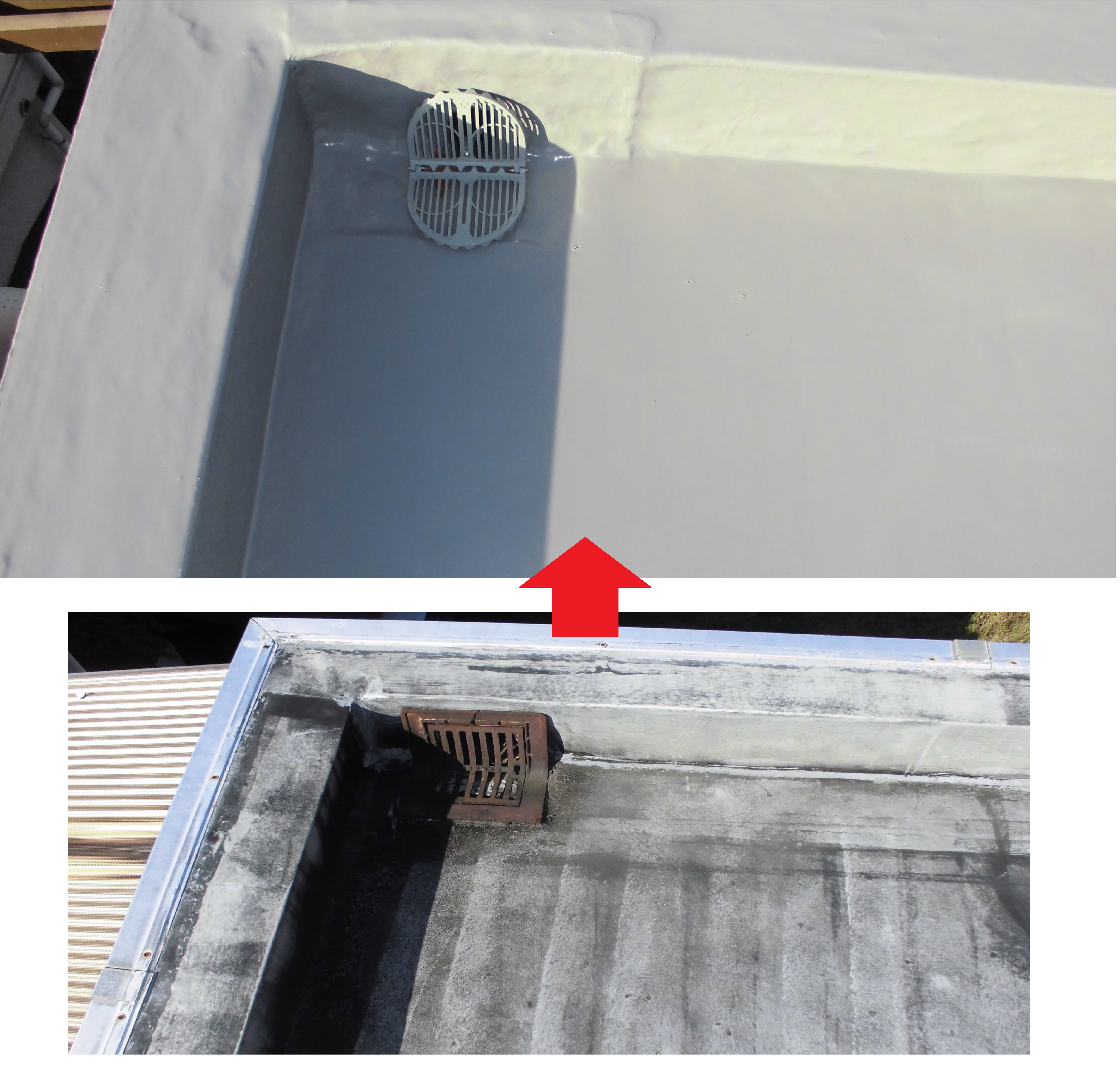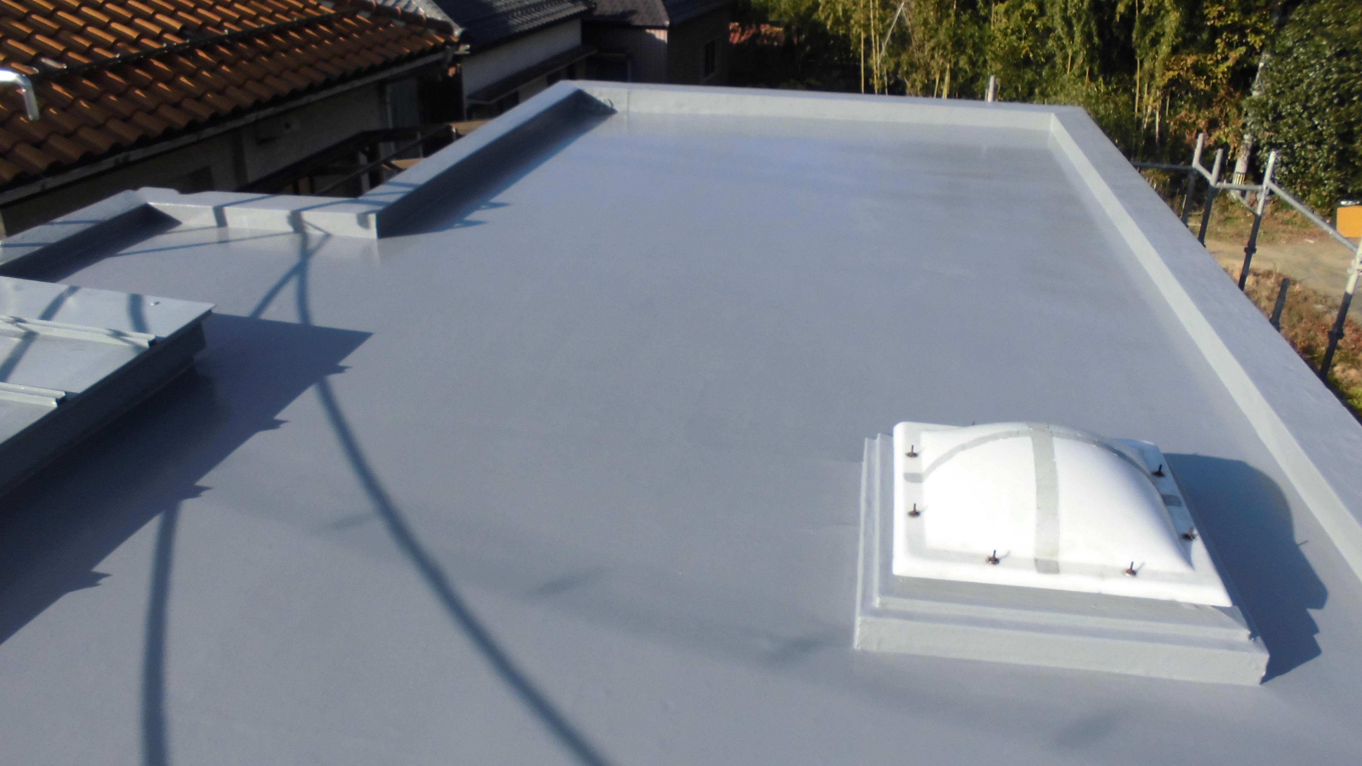 明り取り部分や角の立ち上がり継手、ドレンの部分も継ぎ目無いシームレスな防水層に仕上げることが出来ました。