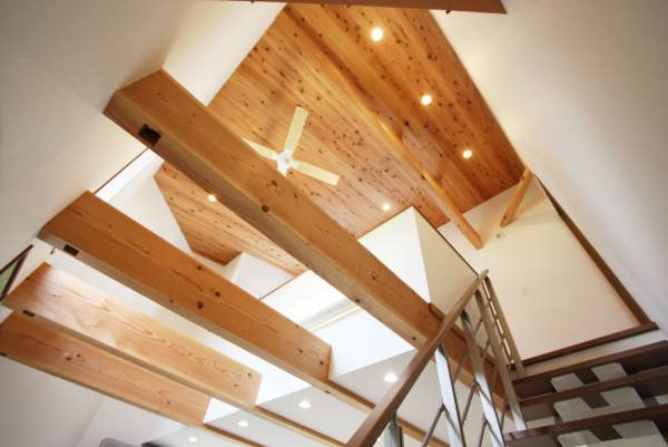 リビングの天井は半分吹き抜けにして、自然な光を確保しました。1階2階にあかりが採れるように2段の窓を配置。リビング上の2階の踊り場は、冬はひなたぼっこができるほどです。